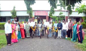 सेवानिवृत्ती सोहळ्यात विद्यार्थ्यांना शालेय साहित्य व सायकल वाटप.