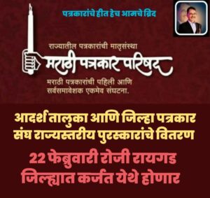 अ. भा. मराठी पत्रकार परिषदेच्या आदर्श जिल्हा आणि आदर्श तालुका पत्रकार संघ पुरस्कारांचे वितरण 22 फेब्रुवारी रोजी रायगड जिल्ह्यात कर्जत येथे.