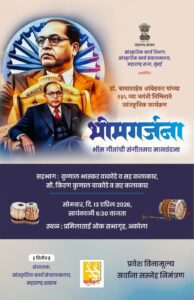 अकोला, दि. १२ :महाराष्ट्र शासनाच्या सांस्कृतिक कार्य विभागातर्फे भारतरत्न डॉ. बाबासाहेब आंबेडकर यांच्या १३५ व्या जयंतीनिमित्त ‘भीमगर्जना’ या विशेष सांस्कृतिक कार्यक्रमाचे आयोजन महाराष्ट्रातील सहा महसूल विभागात करण्यात आले आहे. या कार्यक्रमाच्या माध्यमातून भीम गीतांची संगीतमय मानवंदना अर्पण करून डॉ. आंबेडकरांच्या विचारांना आणि कार्याला अभिवादन करण्यात येणार आहे.